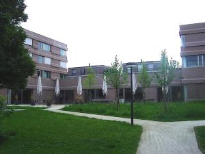 Zeka-Wohnhaus und ökumenisches Zetrum, Gartenanlage ReferenskodQ.8.5Visningsdatum2012 - 03.10.2025NivåDossier Q Hauri, Hans, Fotos von Dättwil Q.8 Hochstrasse mit Siedlungen Pilgerhof, Pilgerstrasse 3 bis 15, Zeka Woh…