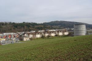 Husmatt, Rundturm und Siedlung, Stanpunkt Friedhof ReferenskodQ.20.3Visningsdatum2008 - 03.10.2025NivåDossier Q Hauri, Hans, Fotos von Dättwil Q.20 Zentrumsbauten Husmatt